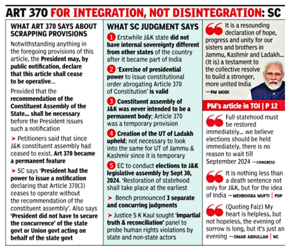 विभिन्न क्षेत्रों में अलग-अलग प्रतिक्रियाएँ-अनुच्छेद 370 पर हाल ही में सुप्रीम कोर्ट के फैसले ने विभिन्न क्षेत्रों में कई तरह की प्रतिक्रियाएँ पैदा की हैं: