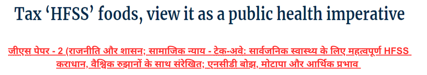 निष्कर्ष: स्वास्थ्य जोखिमों को दूर करने, मोटापे से निपटने और आर्थिक बोझ को कम करने के लिए एचएफएसएस कराधान अनिवार्य है। एक स्वस्थ और टिकाऊ खाद्य प्रणाली को बढ़ावा देने के लिए गैर-प्रतिगामी और पोषण-केंद्रित करों को डिजाइन करना महत्वपूर्ण है।