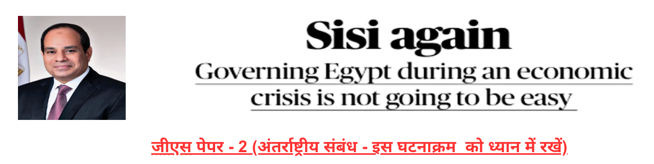 अब्देल फ़तेह अल सिसी तीसरी बार मिश्रा के राष्ट्रपति बने , ये 69 वर्ष के हैं, पहली बार 2014 में राष्ट्रपति बने थे, उन्होंने सेना द्वारा अपने इस्लामी पूर्ववर्ती मोहम्मद मुर्सी सरकार को उखाड़ फेंकने का नेतृत्व किया था। भारत के मिस्र के साथ अच्छे संबंध हैं।