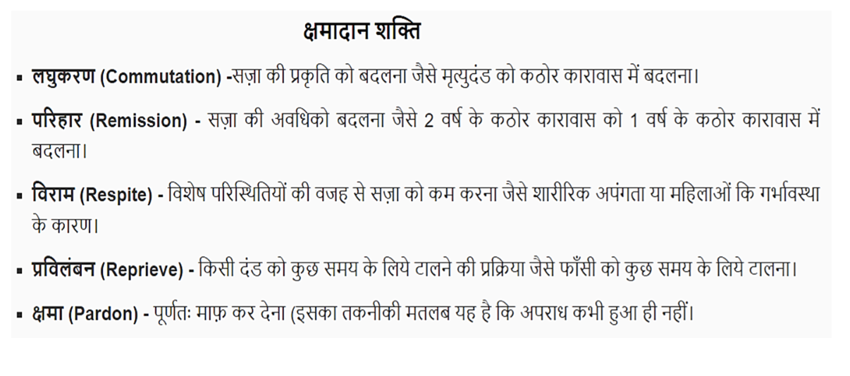 नोट: राष्ट्रपति और राज्यपाल की क्षमादान शक्ति क्रमशः भारतीय संविधान के अनुच्छेद 72 और 161 के तहत उपलब्ध है।