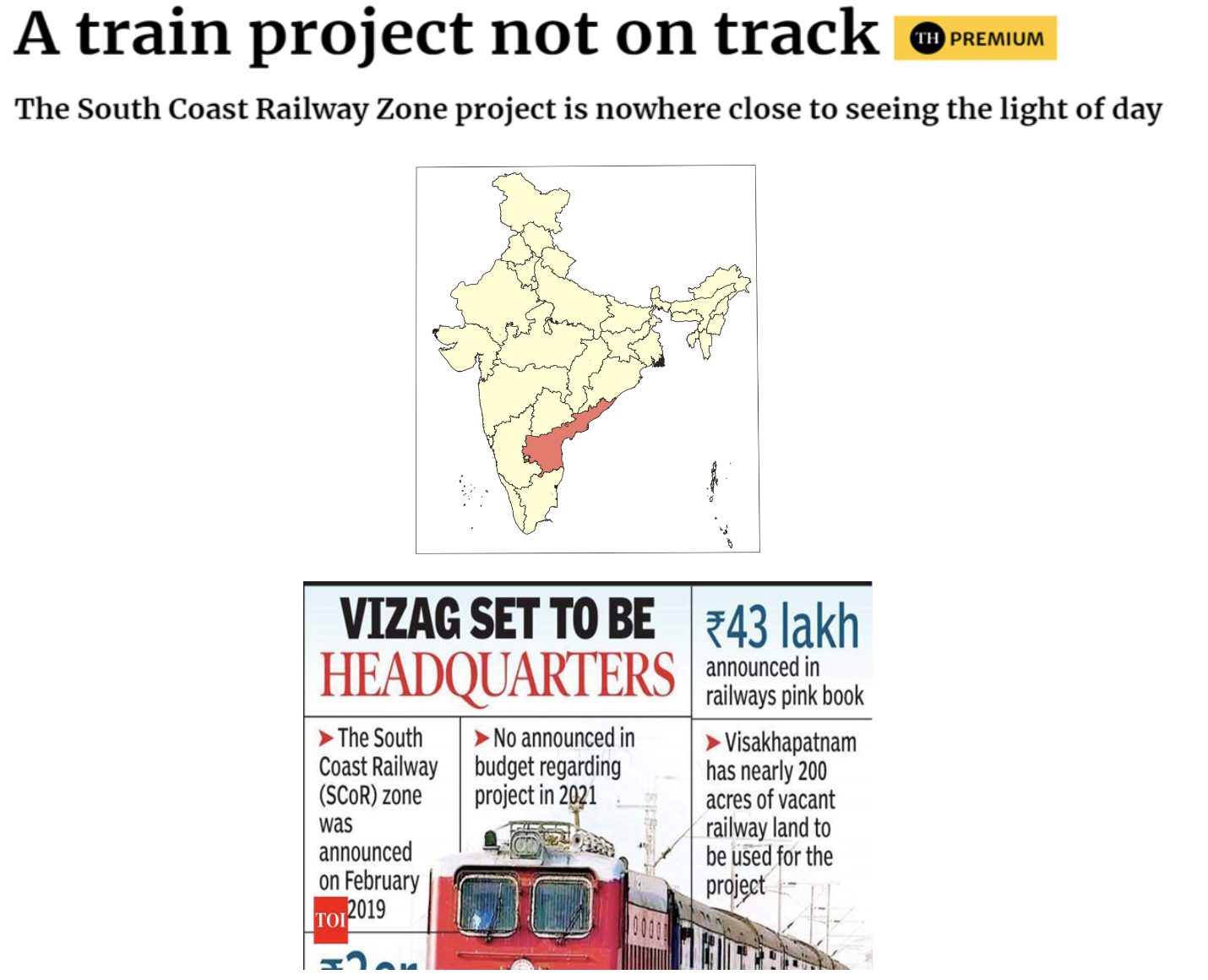 आम चुनाव नजदीक आने के साथ, राज्य में वाईएसआर कांग्रेस पार्टी (YSRCP) सरकार और केंद्र में भारतीय जनता पार्टी (भाजपा) के नेतृत्व वाली सरकार उन परियोजनाओं को पूरा करने की कोशिश कर रही है जो लंबे समय से ठंडे बस्ते में पड़ी थीं। साउथ कोस्ट रेलवे (SCoR) ज़ोन परियोजना, जिसकी घोषणा 2019 में की गई थी और उसके बाद भुला दी गई, ऐसी ही एक परियोजना है।