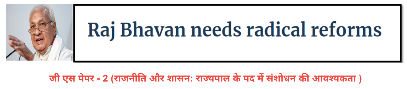निष्कर्ष: केंद्र में भावी सरकारों को मुख्यमंत्री के साथ परामर्श सुनिश्चित करके राज्यपालों की नियुक्ति से संबंधित संविधान के अनुच्छेद 155 में संशोधन करने पर विचार करना होगा, जैसा कि सरकारिया रिपोर्ट में सुझाव दिया गया है। भारत के मुख्य न्यायाधीश की यथोचित महत्वपूर्ण भूमिका के साथ राज्यपाल का चयन करने के लिए एक स्वतंत्र निकाय भी चयन प्रक्रिया की गुणवत्ता में सुधार कर सकता है।