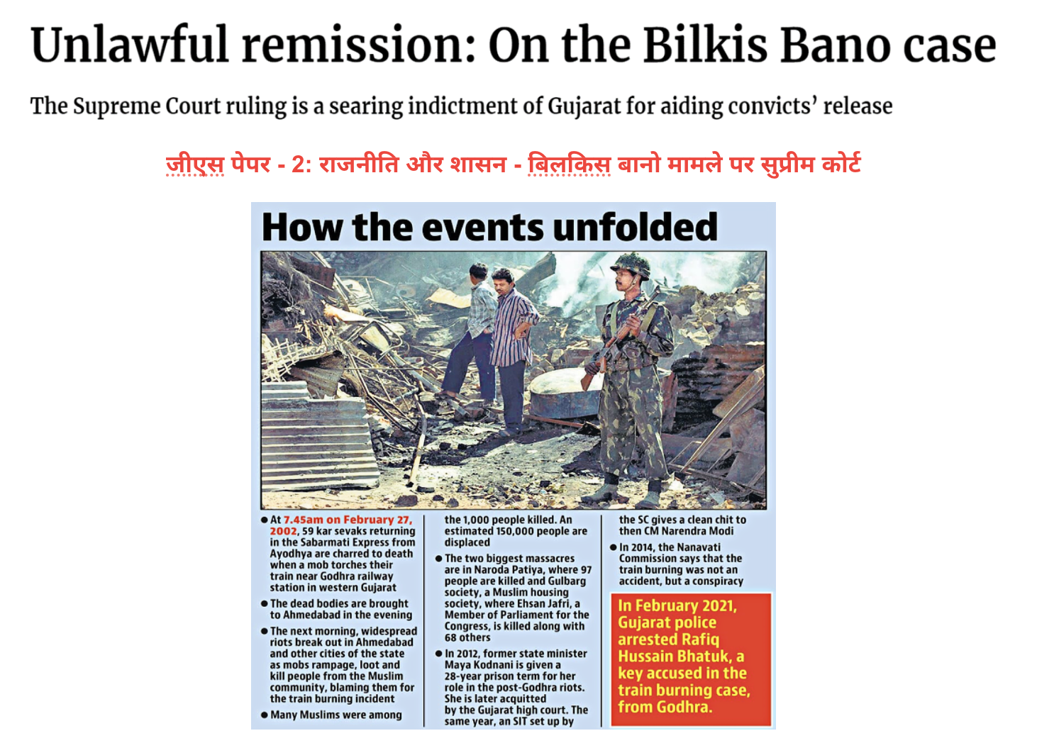 2002 में गुजरात नरसंहार के दौरान जघन्य सामूहिक बलात्कार और एक परिवार के कई सदस्यों की हत्या के लिए दोषी ठहराए गए 11 लोगों को रिहा करने के आदेश को रद्द करने का भारत के सर्वोच्च न्यायालय का फैसला राज्य सरकार पर एक स्पष्ट अभियोग है। 'बिलकिस बानो मामले' की जांच गुजरात पुलिस से केंद्रीय जांच ब्यूरो को स्थानांतरित करने और मुकदमा मुंबई स्थानांतरित करने के बाद मुंबई की एक सत्र अदालत ने इन लोगों को आजीवन कारावास की सजा सुनाई थी। एक अपमानजनक कहानी जो भारतीय जनता पार्टी सरकार द्वारा उनकी समयपूर्व रिहाई की सुविधा देने और मुक्त किए गए लोगों को उनके समर्थकों द्वारा माला पहनाए जाने से शुरू हुई थी, अब अदालत द्वारा उन्हें दो सप्ताह के भीतर जेल लौटने के निर्देश के साथ समाप्त हो गई है। फैसला इस आधार पर दिया गया है कि गुजरात के पास महाराष्ट्र में सजा पाए दोषियों को सजा में छूट देने का फैसला करने का कोई अधिकार क्षेत्र नहीं है।