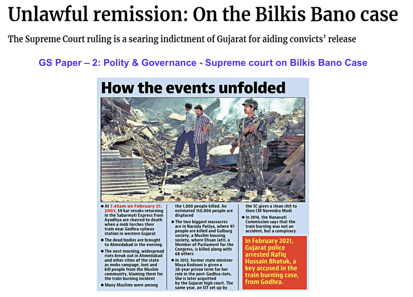 The Supreme Court of India verdict quashing the orders releasing 11 men convicted for the heinous gang-rape and murder of several members of a family during the Gujarat pogrom in 2002 is an unequivocal indictment of the State government. The men had been sentenced to life by a Sessions Court in Mumbai after the investigation in the ‘Bilkis Bano case’ was shifted from the Gujarat police to the Central Bureau of Investigation and the trial transferred to Mumbai. A disgraceful story that began with the Bharatiya Janata Party government facilitating their premature release and the freed men being garlanded by their supporters has now ended with the Court directing them to return to prison within two weeks. The verdict is based on the ground that Gujarat did not have any jurisdiction to decide on granting remission to convicts sentenced in Maharashtra.